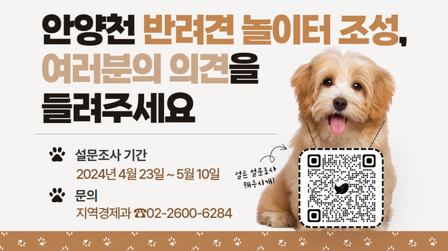 진교훈 구청장은 “반려견 놀이터는 필요한 시설이지만 위치 선정에 있어 주민들의 의견이 갈릴 수 있는 만큼 사업추진을 결정하기에 앞서 주민들의 의견을 듣고자 설문조사를 실시한다”라며 “설문조사에 참여해 소중한 의견 주시길 부탁드린다”라고 말했다.