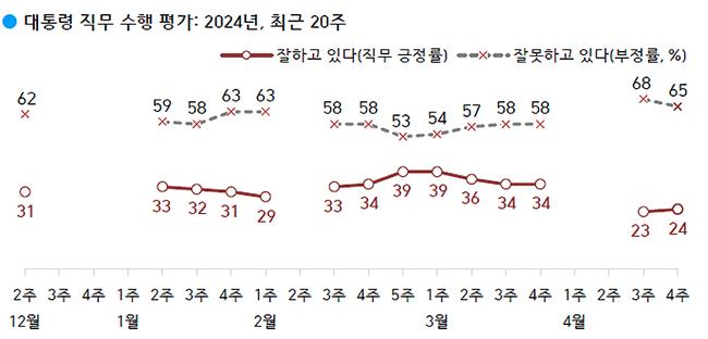 한국갤럽이 2024년 4월 넷째 주(23~25일) 전국 만 18세 이상 유권자 1,001명에게 윤석열 대통령이 현재 대통령으로서의 직무를 잘 수행하고 있다고 보는지 잘못 수행하고 있다고 보는지 물은 결과, 24%가 긍정 평가했고 65%는 부정 평가했으며 그 외는 의견을 유보했다.