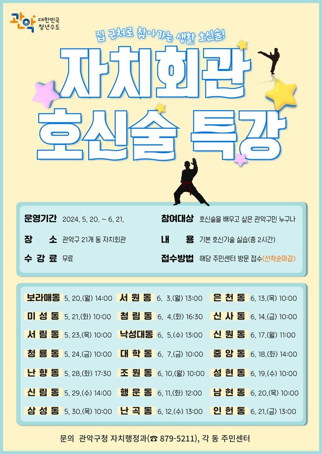 관악구 21개 동 자치회관에서 진행될 호신술 특강은 5월 20일부터 6월 21일 사이에 동별로 진행되며 참여자 접수는 5월 8일부터 각 동 주민센터에서 선착순으로 진행될 예정이다.