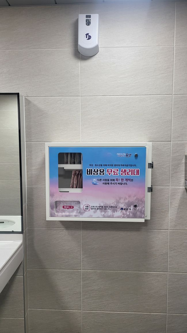 군산시는 작년에 이어 올해에도 여성 · 청소년들이 많이 이용하는 공공시설 5곳에 ‘여성생리용품 무료 자판기’를 확대 설치했다.