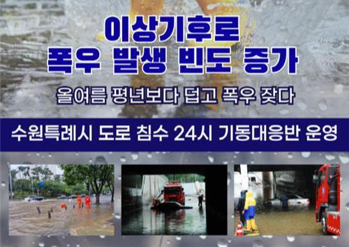 수원시 관계자는 "기후 변화로 인한 예측 불가능한 폭우로 인명·재산 피해가 늘어나고 있다"며 "기상특보가 발효되면 도로침수 24시 기동대응반을 가동하고, 경찰·소방서와 긴밀하게 협력해 안전사고가 발생하지 않도록 신속하게 대응하겠다"고 밝혔다.