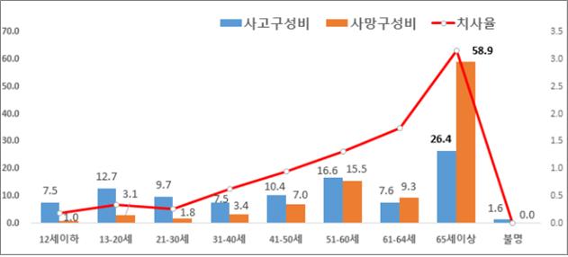 연령대별로는 자전거 운전자의 연령대가 높아질수록 교통사고 치사율*도 함께 높아지는 모습을 보였다.