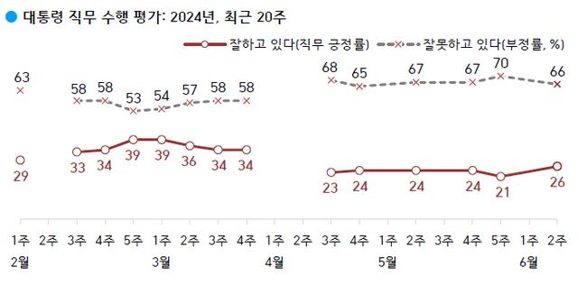 한국갤럽이 2024년 6월 둘째 주(11~13일) 전국 만 18세 이상 유권자 1,000명에게 윤석열 대통령이 현재 대통령으로서의 직무를 잘 수행하고 있다고 보는지 잘못 수행하고 있다고 보는지 물은 결과, 26%가 긍정 평가했고 66%는 부정 평가했으며 그 외는 의견을 유보했다(어느 쪽도 아님 3%, 모름/응답거절 5%).