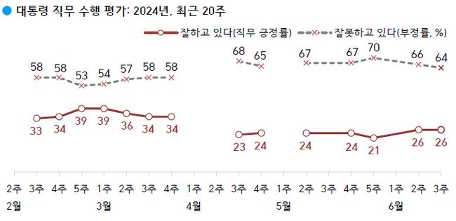 한국갤럽이 2024년 6월 셋째 주(18~20일) 전국 만 18세 이상 유권자 1,002명에게 윤석열 대통령이 현재 대통령으로서의 직무를 잘 수행하고 있다고 보는지 잘못 수행하고 있다고 보는지 물은 결과, 26%가 긍정 평가했고 64%는 부정 평가했으며 그 외는 의견을 유보했다(어느 쪽도 아님 4%, 모름/응답거절 6%).