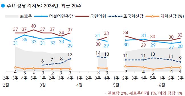 2024년 6월 셋째 주(18~20일) 현재 지지하는 정당은 국민의힘 32%, 더불어민주당 28%, 조국혁신당 9%, 개혁신당 4%, 진보당 2%, 새로운미래 1%, 이외 정당/단체 1%, 지지하는 정당 없는 무당(無黨)층 23%다.