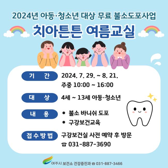 여주시 보건소 건강증진과는 여름방학을 맞이하여 아동·청소년 대상 무료 불소 도포 사업 `치아튼튼 여름교실`을 7월 29일부터 운영한다고 밝혔다.