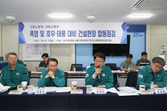 박상우 국토부 장관과 이정식 고용부 장관은 현장에서 집중호우 시 침수에 대비한 지하층 양수기 설치 등 배수 조치 현황과 태풍 시 타워크레인, 건설용리프트 등 대형 구조물 붕괴 예방 안전조치, 붕괴, 침수 등 재난 발생 시 즉시 작업중지 및 근로자 대피 등 비상 대응 태세를 점검하고, 장마 이후 본격적으로 찾아올 폭염 대비 근로자 온열질환 예방 안전수칙 이행 여부도 확인했다.