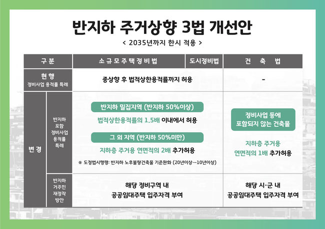 반지하 거주민 주거 상향을 위해 반지하주택 정비 시 용적률 가산 등 ‘반지하 거주민 주거 상향 3법’ 개정이 필요하다는 주장이 제기됐다.