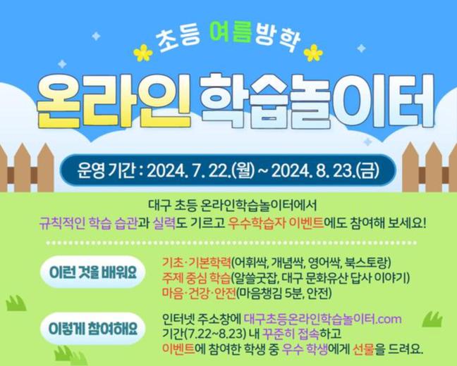 대구시교육청(교육감 강은희)은 오는 7월 22일(월)부터 8월 23일(금)까지 5주간 초등학생의 알찬 여름방학을 지원하기 위해 `초등 온라인학습놀이터`를 운영한다.