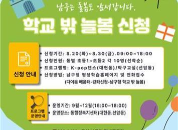 `남구형 학교 밖 늘봄프로그램`은 학교 밖 돌봄의 한계를 극복하고, 초등학생 자녀를 안심하고 맡길 수 있는 빈틈없는 돌봄체계를 구축하기 위해 남구청에서 추진하는 사업으로 2025학년도 본 사업 행을 위한 시범운영을 오는 9월부터 12월까지 시범 실시한다.