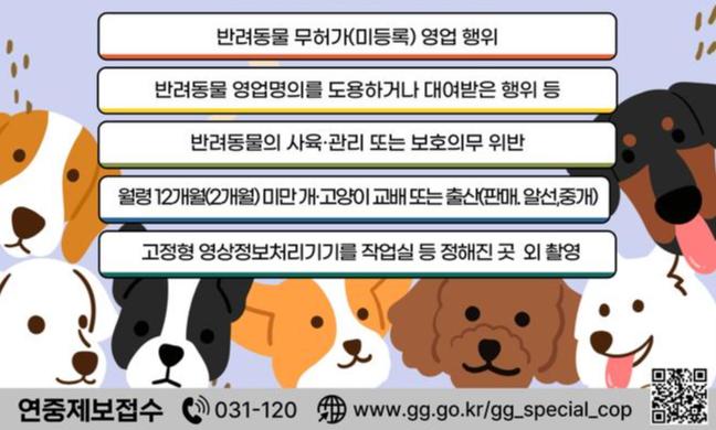 기이도 경기도 특별사법경찰단장은 "사각지대 없이 반려동물 영업장 내 불법행위를 근절하겠다"면서 "도민들의 많은 관심과 제보를 부탁드린다"고 말했다.