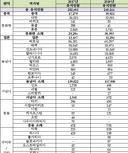 한편 2018년 한 해 동안 한국을 방문한 해외 기업회의 및 기업인센티브단체 관광객은 248,244명으로 전년 202,501명 대비 22.6%증가했다. 올해에도 베트남 페인트 제조회사 ‘4 Oranges’, 인도네시아 ‘알리안츠’ 그룹등 대형 인센티브 단체가 잇달아 입국하는 등 인센티브 관광객은 꾸준한 증가세를 보이고 있다.