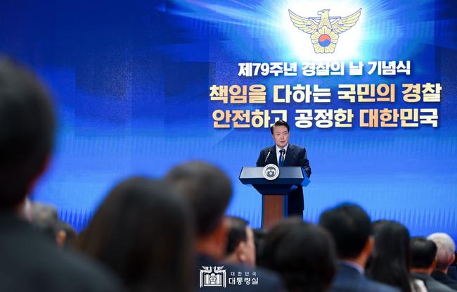 윤석열 대통령이 21일 경찰청에서 열린 제79주년 경찰의 날 기념식에 참석해 국민의 생명과 안전을 지키는 경찰관들의 헌신에 감사의 뜻을 전했다.