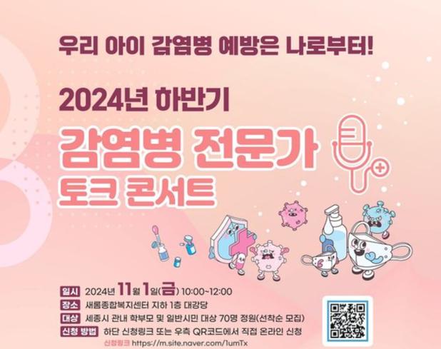 세종특별자치시 감염병관리지원단이 내달 1일 오전 10시 새롬종합복지센터 지하 1층 대강당에서 ‘2024년 하반기 감염병 전문가 토크 콘서트’를 연다.