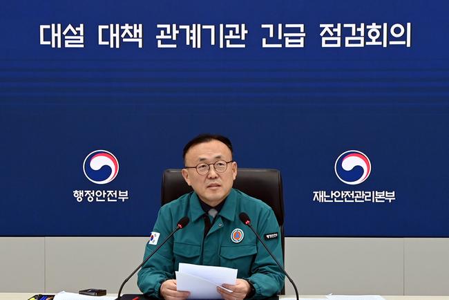 행정안전부는 이한경 재난안전관리본부장 주재로 관계기관과 대책 점검회의를 열어 피해 현황과 보완책을 논의했다. 대설로 인한 피해는 비닐하우스 붕괴, 가로수 전도, 도로 결빙으로 인한 교통사고와 보행자 낙상, 정전, 격오지 고립 등으로 나타났다.