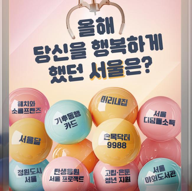 서울시는 12월 3일부터 9일까지 올해 시민을 가장 행복하게 한 정책을 선정하기 위한 「2024 서울시 10대 뉴스」 온라인 투표를 실시하며, 최종 순위는 시민 투표로 결정된다.