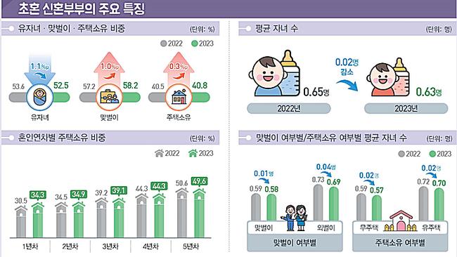 초혼 신혼부부 중 자녀가 있는 부부 비중은 52.5%로 전년보다 1.1%p 하락했다. 평균 자녀 수는 0.63명으로 전년(0.65명) 대비 감소했다.