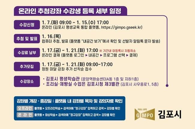 김포시 평생학습관에서 2025년 제1기 정규강좌 수강생을 오는 1월 7일(화)부터 1월 15일(수)까지 모집한다.