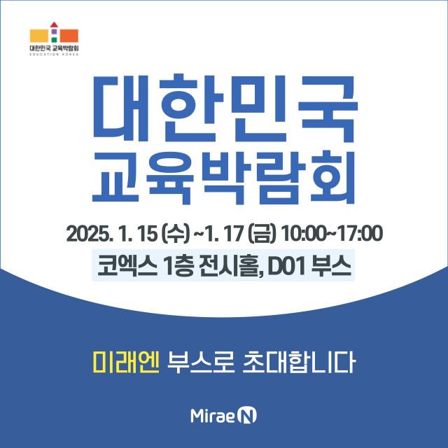 교과서 발행부수 1위 기업 미래엔이 오는 1월 15일부터 17일까지 서울 코엑스에서 열리는 ‘2025 대한민국 교육박람회’에 참가해 AI 디지털 교과서를 비롯한 에듀테크 솔루션과 다양한 디지털 학습 서비스를 선보인다고 밝혔다.