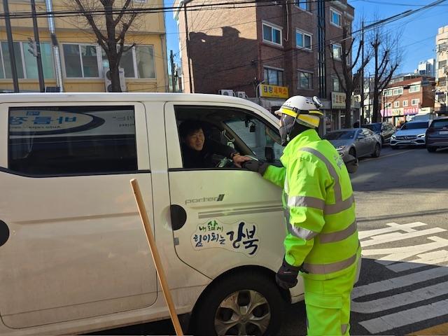 강북구는 구청 청소행정과 공무원 4명을 2인(일반직 1명과 차량직 1명) 1조로 편성해 365일 도로 청소 순찰을 실시하고 있다. 평일은 오전 6시 30분부터 오후 4시까지, 주말과 공휴일에는 오전 7시부터 11시까지 수시로 운영한다.