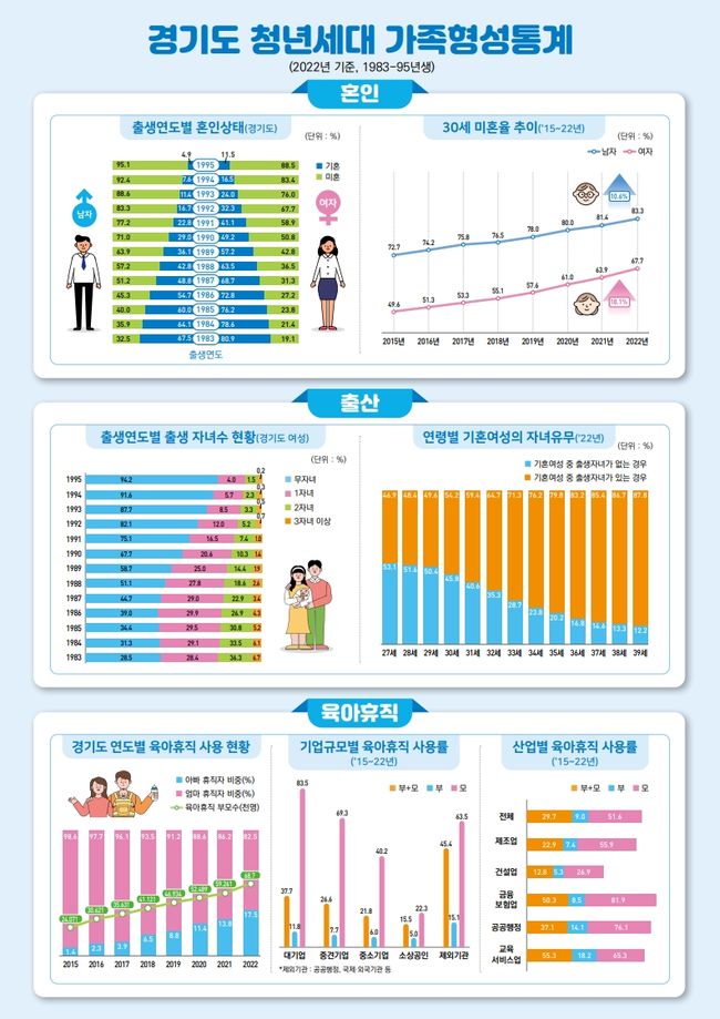 경기도 1983~95년생 부모의 육아휴직 현황도 통계에서 확인가능하다. 1983~95년생 부모 중 육아휴직을 사용(2015~22년)한 사람은 22.7%로, 열명 중 두명꼴로 육아휴직을 사용해 육아휴직제도가 잘 활용되는 것으로 나타났다. 그러나 사용자의 다수가 여성이고, 대기업과 공공부문에 종사하는 부모의 육아휴직 사용률이 상대적으로 높게 나타나 제도 활용의 불균형을 보여주기도 했다.