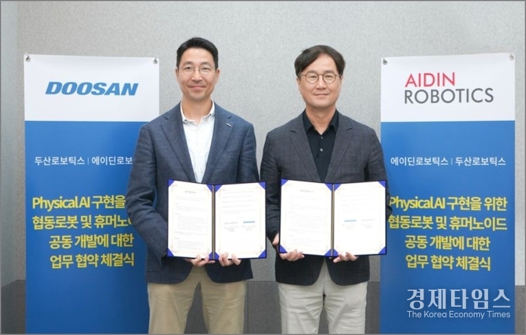 경제타임스 김은국 기자 | 두산로보틱스가 정밀 센서 전문기업 에이딘로보틱스와 손잡고 ‘피지컬 AI(Physical AI)’ 기반 양팔형 휴머노이드 플랫폼 개발에 나섰다. 양사의 기술 결합으로 로봇이 ‘스스로 판단해 작업하는’ 자율지능형 산업 로봇 시대가 앞당겨질 전망이다.