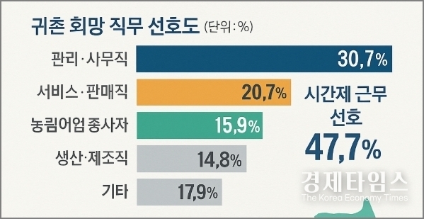 귀촌 희망 지역으로는 △충청권(32.9%) △강원권(27.4%) △호남권(15.9%) △영남권(10.4%) 순이었다. 희망 직무는 관리·사무직(30.7%), 서비스·판매직(20.7%), 농림어업(15.9%), 생산·제조직(14.8%) 등으로, 근무형태는 시간제(47.7%) 선호가 가장 높았다. 희망 임금은 월 평균 227만원 수준이었다.