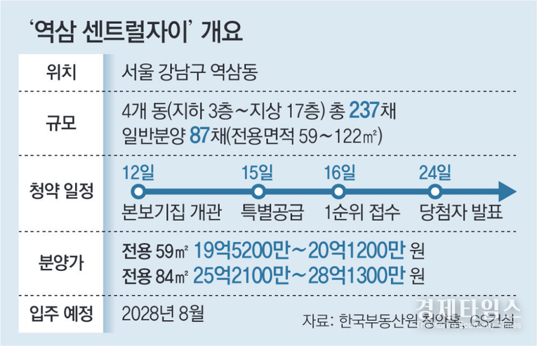 경제타임스 이준오 기자 | 당첨될 경우 10억 원 이상 시세 차익이 예상되는 강남`역삼센트럴자이' 아파트 청약 일정이 시작됐다.