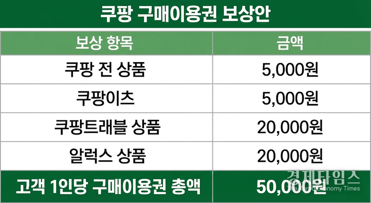 쿠팡에 따르면 보상 대상은 지난해 11월 말 개인정보 유출 통지를 받은 고객 전원이다. 와우회원과 일반회원 구분 없이 지급되며, 이미 탈퇴한 고객도 포함된다. 고객들은 내년 1월 15일부터 쿠팡 앱에서 구매이용권을 순차적으로 확인할 수 있다.