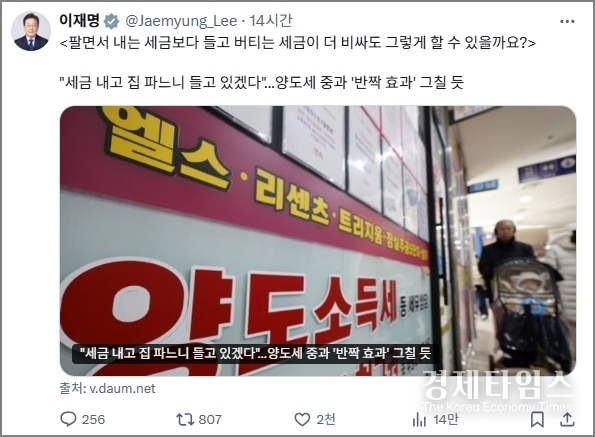 경제타임스 이준오 기자 | 이재명 대통령이 지난 1월25일 자신의 SNS에 다주택자에 대한 부동산 세제 메시지를 4차례나 내놓으면서 다주택자들의 향후 움직임이 초미의 관심사로 떠오르고 있다.