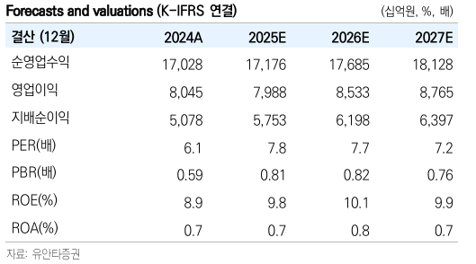 배당 정책과 관련해, 2026년에는 배당성향을 25%로 확대해 DPS(주당배당금)가 약 1,200원에 이를 것으로 전망했다. 2027년에는 감액배당을 실시하되 전년 대비 5% 증가 수준을 유지할 것으로 예상했다. 이에 따라 총주주환원율은 2025년 54.1%, 2026년 55.2%로 높아질 것으로 분석됐다.