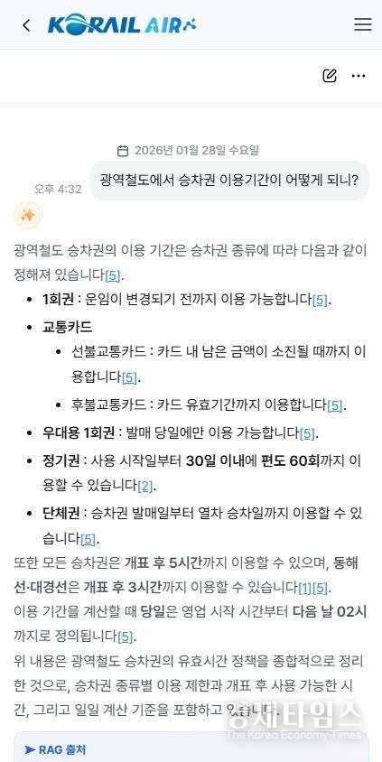‘에어’는 코레일 내부의 방대한 사규, 업무 편람, 매뉴얼 및 철도 관련 법령을 자연어 질의응답 방식으로 검색할 수 있는 업무 전용 AI 시스템이다. 직원들은 복잡한 규정을 일일이 찾을 필요 없이 대화하듯 질문하여 필요한 정보를 즉시 확인할 수 있으며, 답변과 함께 근거 문서의 출처가 제시되어 업무의 정확성과 신뢰도를 동시에 확보할 수 있다.