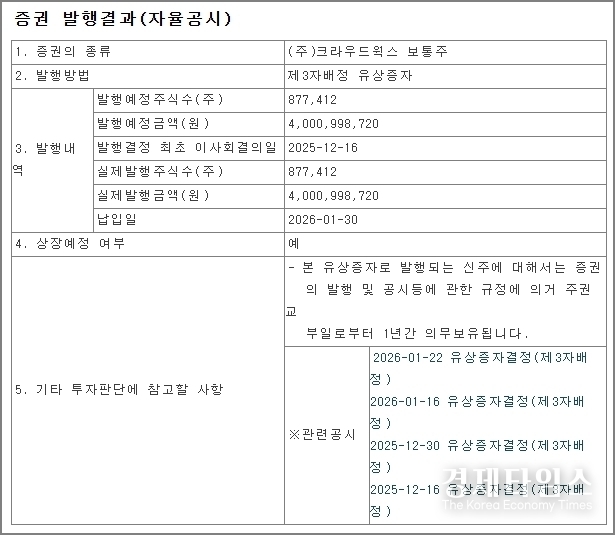 2월 2일 확인된 공시에 따르면, 크라우드웍스는 지난 1월 30일 제3자배정 유상증자 대금 40억원의 납입이 완료되었음을 공식화했다. 이번 증자를 통해 발행된 신주는 보통주 87만7412주이며, 배정 대상자는 김광일 대표가 이끄는 엑스알피1호조합이다.