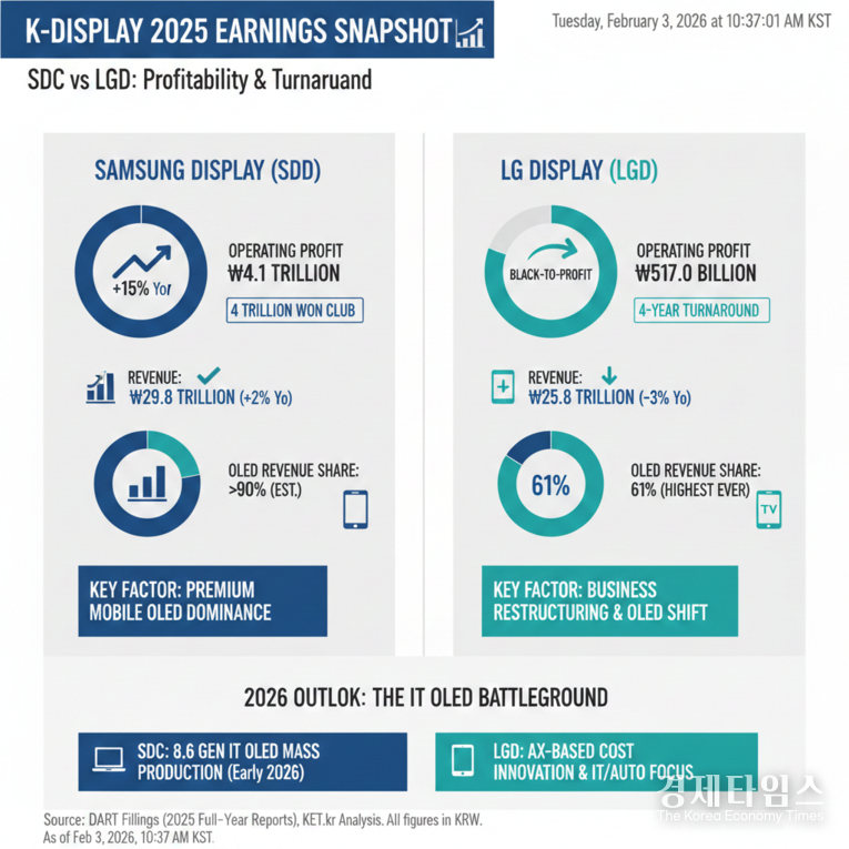 삼성디스플레이는 글로벌 경기 둔화 속에서도 프리미엄 시장을 장악하며 견고한 수익성을 과시했고, LG디스플레이는 긴 적자의 터널을 벗어나 연간 흑자 전환이라는 값진 결실을 맺었다.
