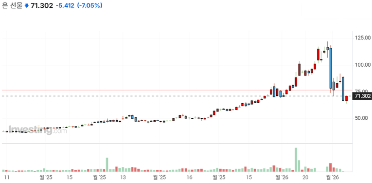경제타임스 온인주 기자 | 국제 은 선물 가격이 장중 10% 넘게 폭락하며 시장에 큰 충격을 주고 있다. 한국시간 오전 10시 51분 기준 은 선물 가격은 전일 대비 7.94% 하락한 70.620달러를 기록 중이며, 장중 변동성은 더욱 확대되는 양상이다.