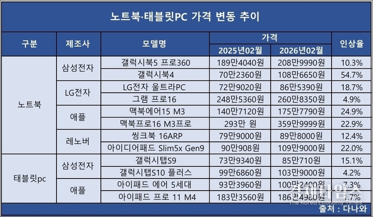 가격비교 사이트 다나와의 조사 결과는 더 구체적이다. 최근 1년간 노트북 가격은 평균 21.3%, 태블릿PC는 7% 상승했다.