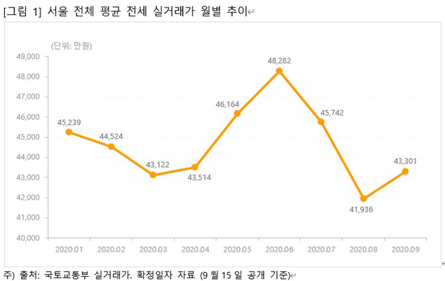 (주)직방이 국토교통부 전세 실거래가 데이터를 통해 서울 전세시장을 분석한 결과, 서울 전세 실거래가격이 지난 6월에 평균 4억8282만원으로 역대 최고가격으로 거래됐으나 7월에는 평균 4억5742만원으로 전월 대비 2540만원 떨어졌다. 8월에는 평균 4억1936만원(전월대비 3806만원 하락)으로 낙폭이 커졌다.