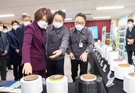 한정애 환경부 장관은 2월 4일 오후 경북 칠곡군에 위치한 TK케미칼 폴리에스터 공장을 방문해 재생페트 원사 및 의류 생산 공정을 살펴보고, 올해가 순환경제 구축 원년이 될수 있도록 재생원료 사용 확대 대책을 집중 추진하겠다고 밝혔다. (사진=환경부) 환경부는 국민이 체감할 수 있는 현장중심의 순환경제 정책을 추진하기 위해 현장 소통을 본격적으로 시작했다.