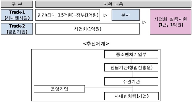 선정된 주관기관에는 사내벤처팀의 사업화 등 지원 자금은 물론 자체 창업 지원 프로그램 운영비로 최대 3억원이 지원되며, 최소 2년간 사업 수행이 보장되고 성과평가를 거쳐 수행 기간 연장도 가능하다.