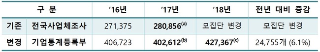 모집단 변경 결과 2018년 기준 1인 창조기업 수는 총 42만 7367개로 나타났다. 기존에 전국사업체조사를 근거로 한 결과에서는 2017년 28만 856개였으나 모집단이 변경돼 시계열 비교는 불가능하며, 대신 동일한 기준인 기업통계등록부와 비교해서는 2017년 40만 2612개에서 2018년 42만 7367개로 소폭 증가했다.