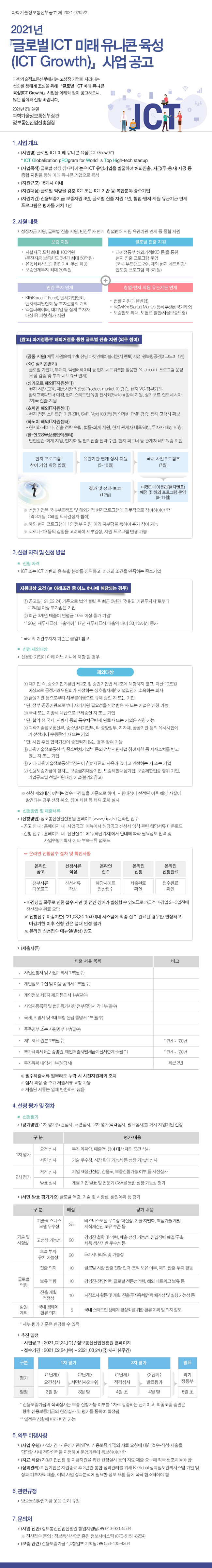 과학기술정보통신부(이하 과기정통부)는 정보통신기술(ICT) 분야의 유망 기업이 고성장할 수 있도록 성장자금·해외진출 등을 종합 지원하는 ‘2021년 글로벌 ICT 미래 유니콘 육성사업(ICT GROWTH)’의 공고를 24일 실시한다고 밝혔다.