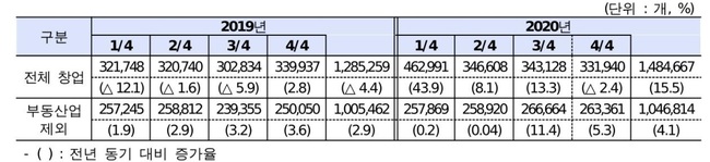 중소벤처기업부(이하 중기부)는 ‘2020년 창업기업 동향’을 발표하고 창업기업이 148만 4667개로 집계됐다고 밝혔다. 이는 전년도에 비해 15.5% 늘어난 수치다. 작년 초 주택임대소득 사업자등록 의무화로 대폭 증가한 부동산업을 제외하더라도 같은 기간 4.1% 증가했다.