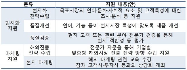 ‘소프트웨어 기업 수출활동 지원’ 사업은 소프트웨어 제품의 미국, 베트남, 일본 등 해외 현지화와 마케팅을 지원하는 사업으로, 9개 중소기업에 소프트웨어 제품의 현지화 비용 6000만원 수준과 함께, 해외진출전략 수립을 위한 전문가 자문, 해외 판로 개척을 위한 잠재 고객사 연결, 마케팅 역량강화 교육 등을 지원한다.