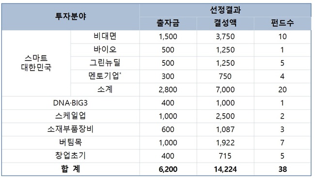 한편, 한국판 뉴딜의 상징인 '스마트대한민국펀드'는 1차 정시 출자사업을 통해 7000억원을 선정했다.