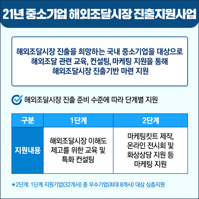 작년부터 추진해온 ‘2021년 중소기업 해외조달시장 진출지원사업’은 케이(K)-방역제품 수출호조 등 코로나19 이후 유망수출시장으로 주목받고 있는 해외조달시장 진출을 희망하는 국내 중소기업을 대상으로 해외조달 관련 교육, 컨설팅, 마케팅 지원을 통해 해외조달시장 진출기반 마련을 지원하는 사업이다.