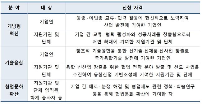 포상 분야는 개방형 혁신, 기술융합, 협업문화 확산 등 세 분야로 주관기관인 중소기업융합중앙회에서 요건확인과 포상심사 등의 절차를 거쳐 중기부에 추천하고, 중기부는 행정안전부와 협의해 포상자를 최종 선정하게 된다.