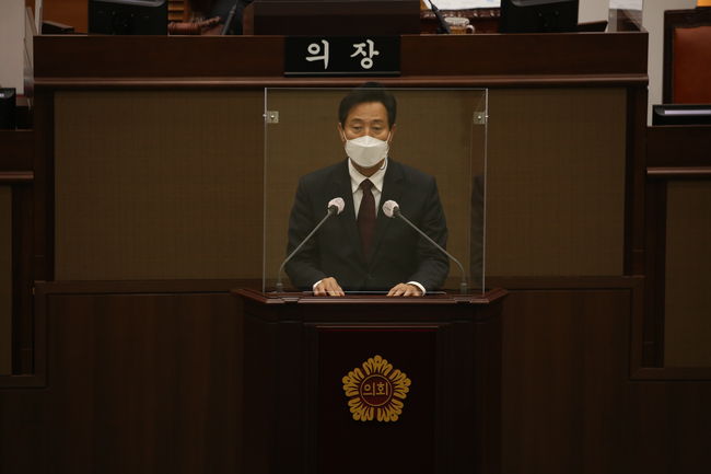 오세훈 서울시장이 19일 오후 서울 중구 서울시의회에서 열린 시의회 `제300회 임시회 개회식`에 참석해 축사를 하고 있다. 조희연 서울시교육감이 19일 오후 중구 서울시의회에서 열린 시의회 `제300회 임시회 개회식`에 참석해 축사를 하고 있다.