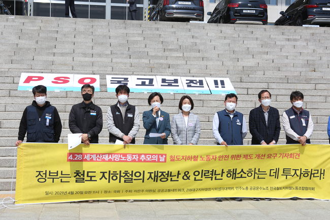 20일 민주노총 공공운수노조 조합원 및 정의당 강은미 원내대표, 이은주 의원은 4.28 세계산재사망노동자 추모의 날을 앞두고 서울 여의도 국회 본청 앞에서 정부에 철도 지하철 노동자 안전 위한 제도 개선을 요구하는 기자회견을 가졌다.