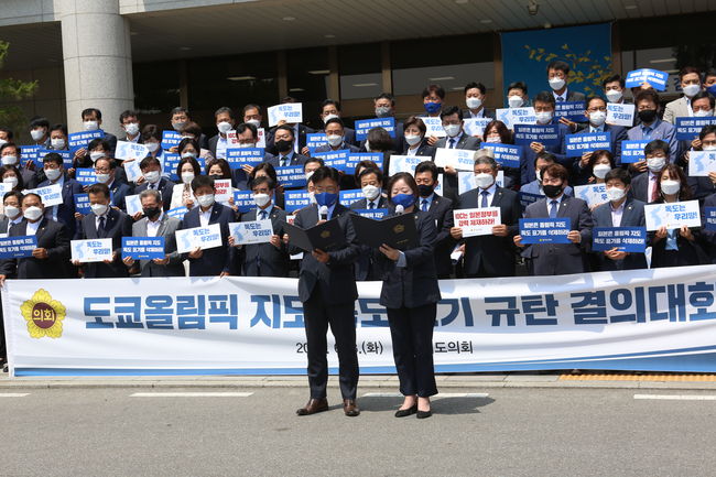 결의대회에서 의원들은 "도쿄 올림픽 조직위원회가 올림픽 홈페이지에 독도를 자국의 영토로 표기했고, 이에 우리 정부가 항의하자 카토 관방장관은 기자회견을 열고 `다케시마는 일본의 고유한 영토`라고 발언, 국민적인 분노가 일고 있다"고 전했다.