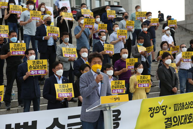 코로나19 손실보상법 소급적용을 주장하면서 정의당과 피해 상인들이 28일 국회 본청 앞 계단에서 결의대회를 가졌다. 결의대회에서 여명국 정의당 대표는 “코로나 손실보상법 처리가 결국 6월 중 국회 처리도 불투명해졌다”며 “정부와 민주당이 코로나 손실에 대한 소급적용을 하지 않기로 가닥을 잡았기 때문인 것으로 짐작된다”고 말했다.